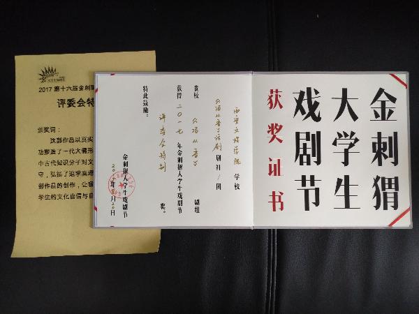 8月20日第十六届“金刺猬”大学生戏剧节闭幕式在京举行。我校原创话剧《冯从吾》一举夺得评委会特别奖、优秀表演奖、优秀剧目奖三项大奖。