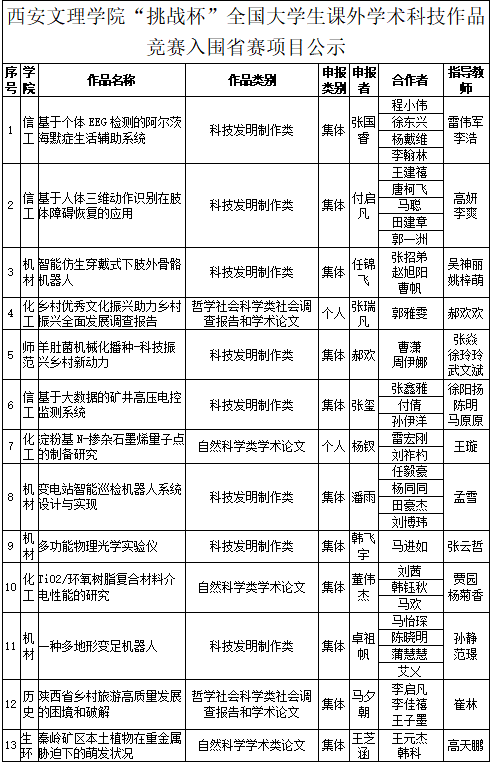 西安文理学院“挑战杯”全国大学生课外学术科技作品竞赛入围省赛项目公示